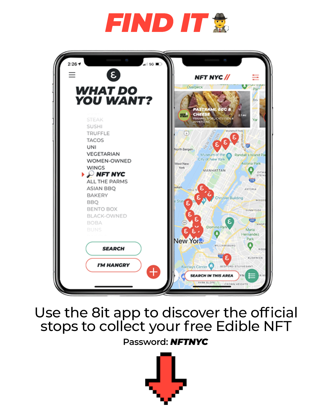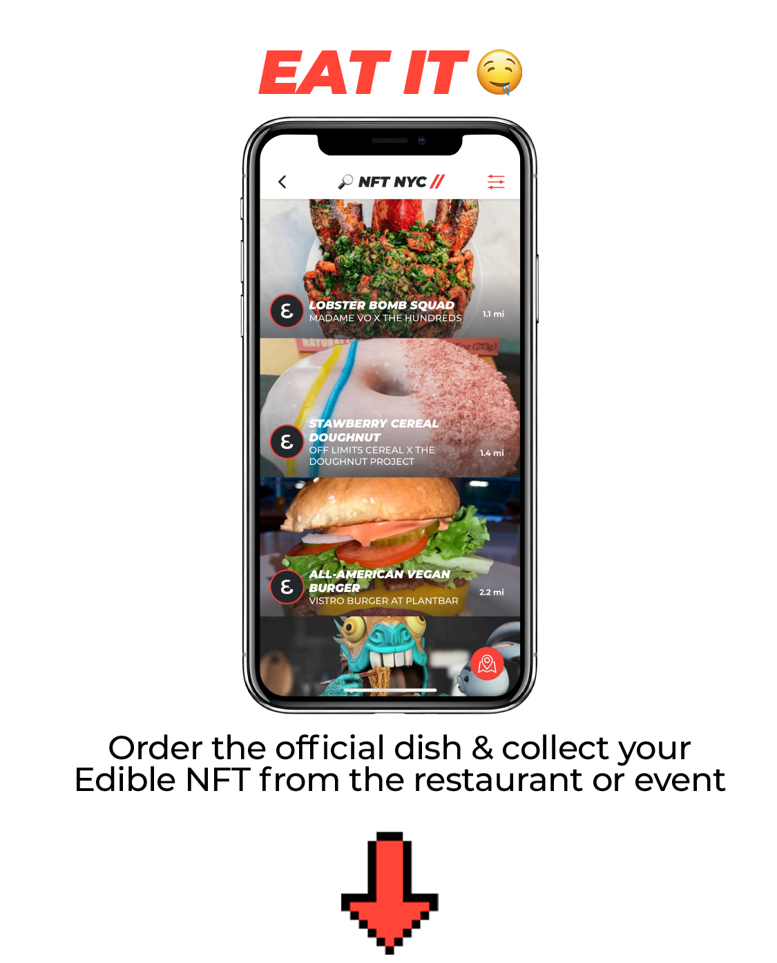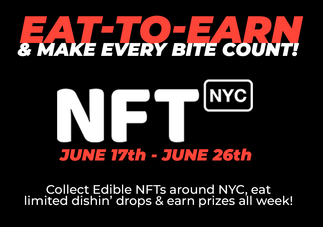 Eat Food at NFT NYC! Use the 8it app to find out Edible NFT enabled dishes and spots under the ‘NFT NYC’ category. Eat dope food and claim your free Edible NFT. Redeem for dope prizes after!